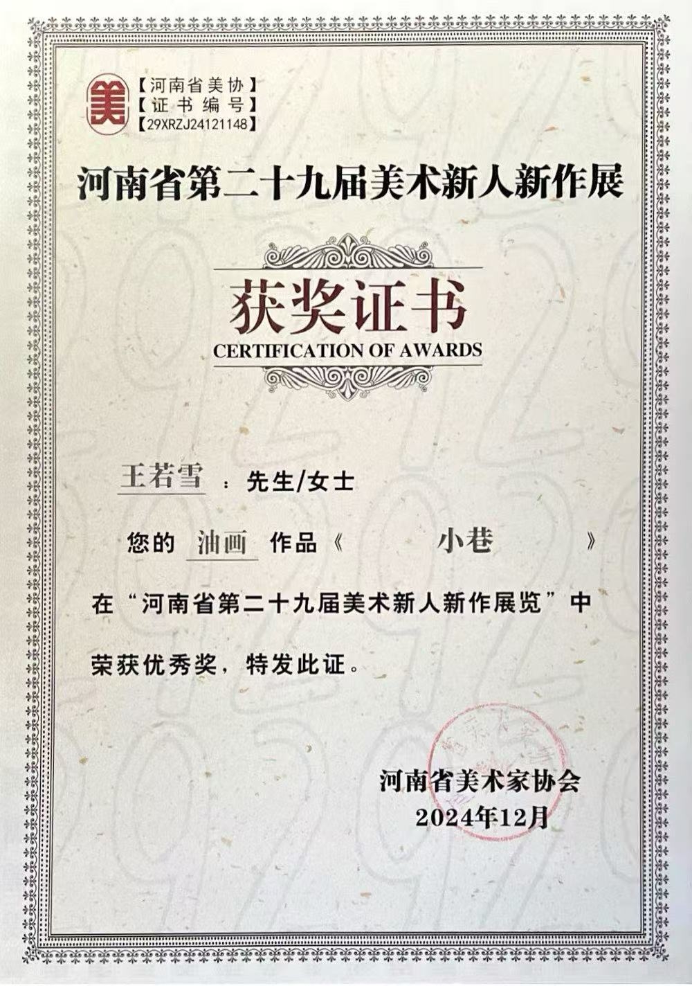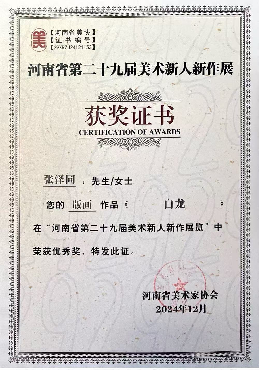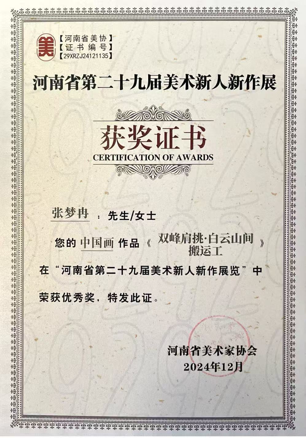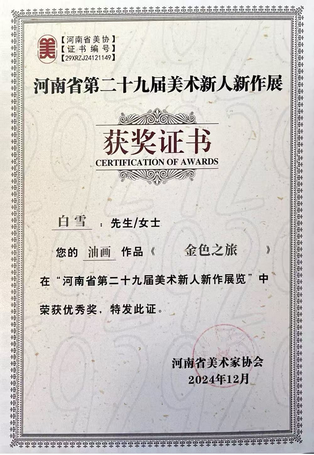 河南省第二十九届美术新人新作优秀奖