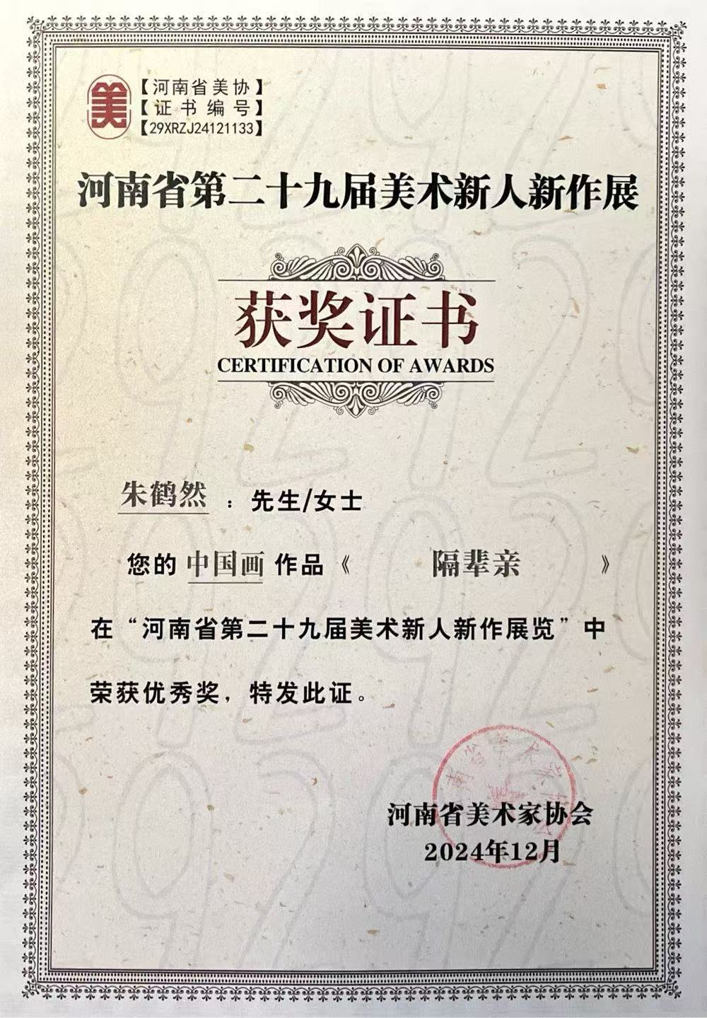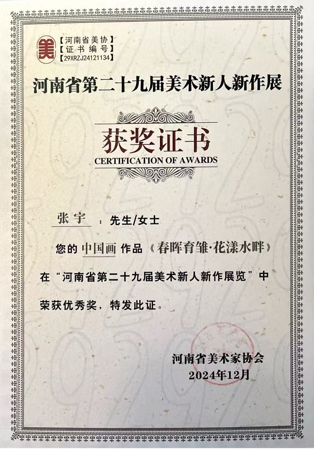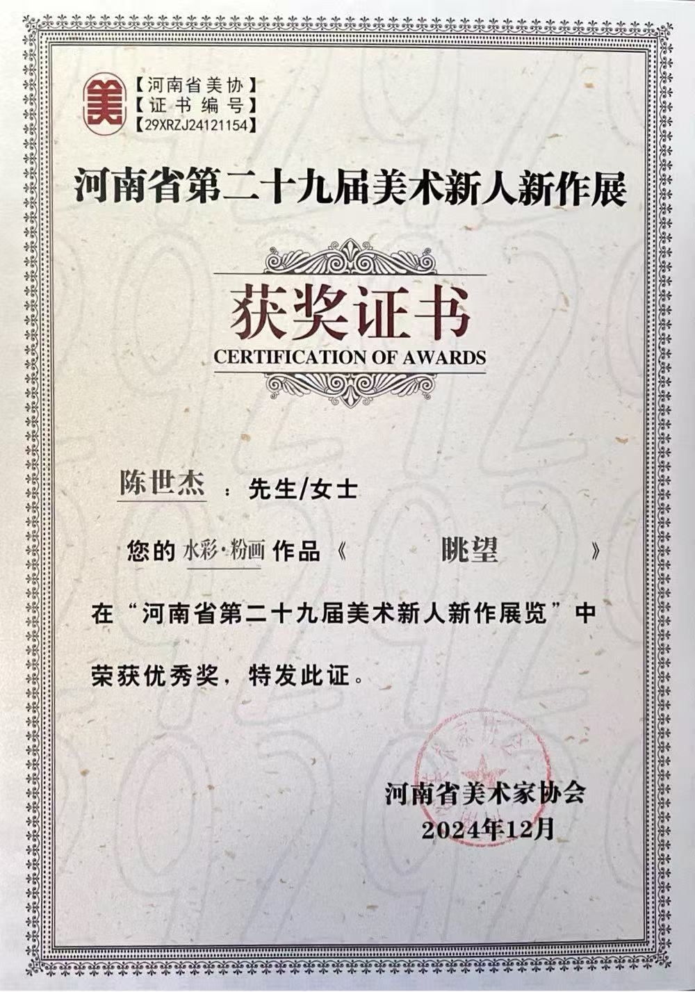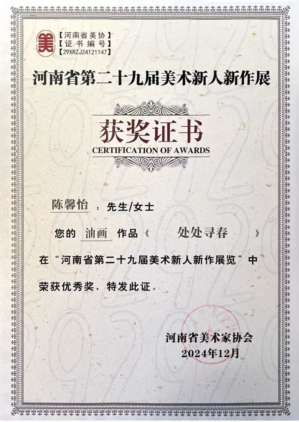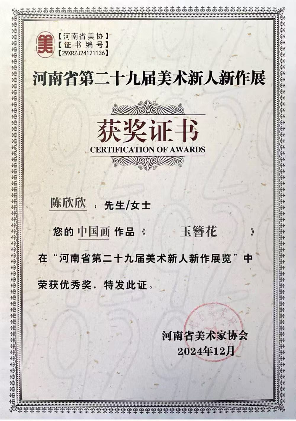河南省第二十九届美术新人新作优秀奖
